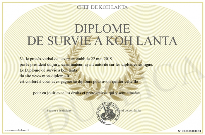 Envoyez par email votre Diplôme de survie a koh lanta personalisé