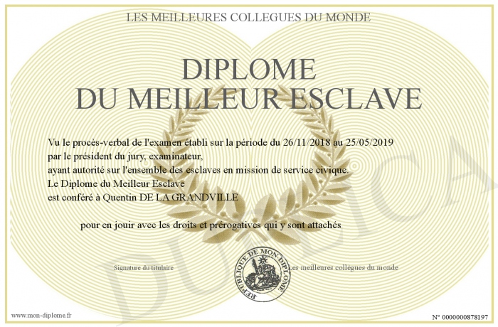 Envoyez par email votre Diplôme du Meilleur Esclave personalisé