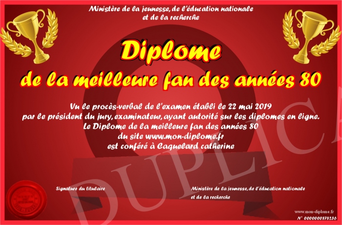 Envoyez par email votre Diplôme de la meilleure fan des années 80 personalisé