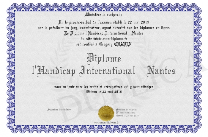 Envoyez par email votre Diplôme l'Handicap International Nantes personalisé