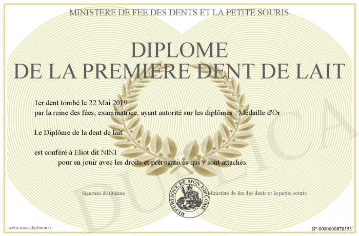 Envoyez par email votre Diplôme de la premiere dent de lait personalisé