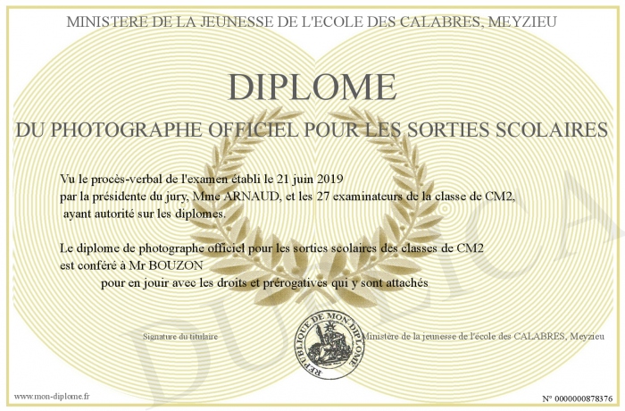 Envoyez par email votre Diplôme du photographe officiel pour les sorties scolaires personalisé