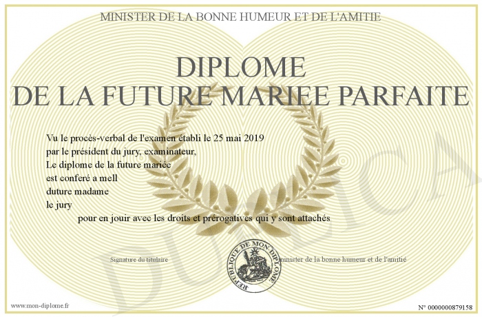 Envoyez par email votre Diplôme de la future mariée parfaite personalisé