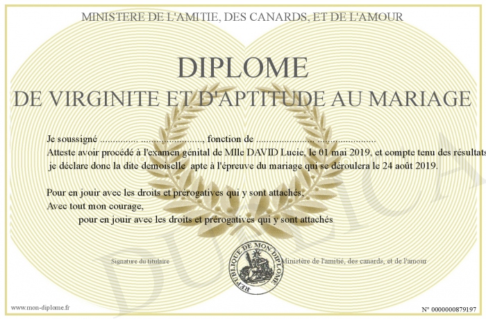Envoyez par email votre Diplôme de virginité et d'aptitude au mariage personalisé