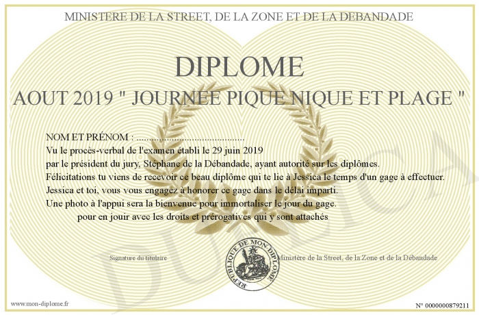 Envoyez par email votre Diplôme AOUT 2019 - Journée Pique Nique et Plage - personalisé