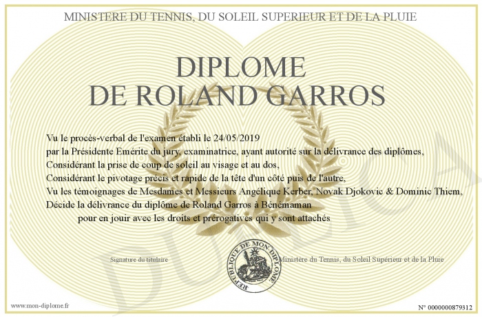 Envoyez par email votre Diplôme de Roland Garros personalisé