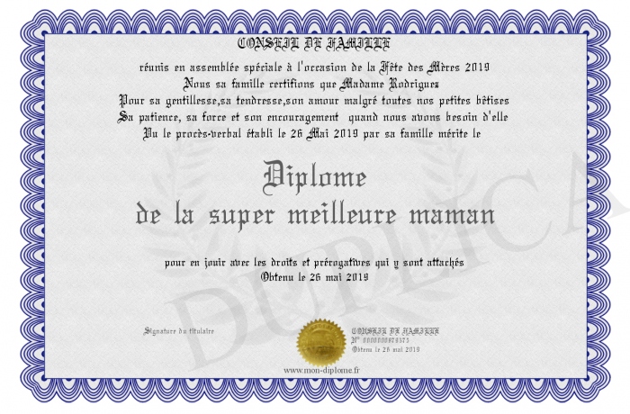 Envoyez par email votre Diplôme de la super meilleure maman personalisé