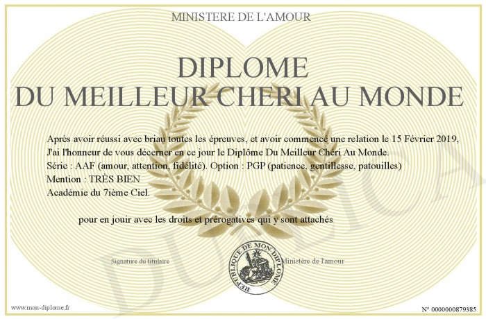 Envoyez par email votre Diplôme Du meilleur chéri au monde personalisé