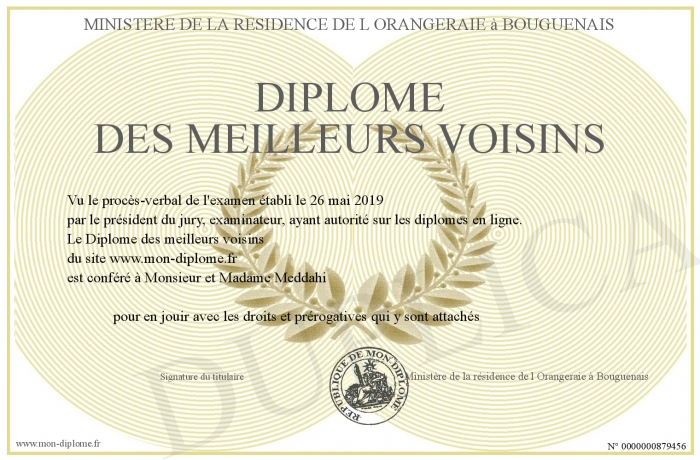 Envoyez par email votre Diplôme des meilleurs voisins personalisé