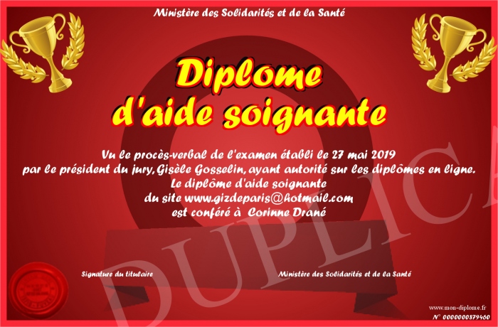 Envoyez par email votre Diplôme d'aide soignante personalisé