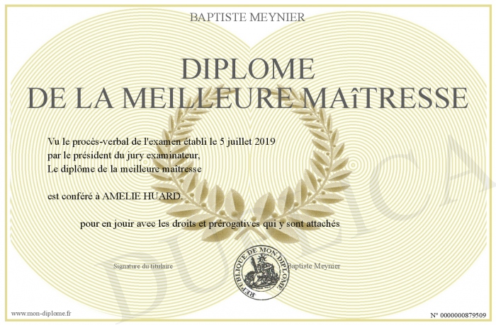 Envoyez par email votre Diplôme de la meilleure maîtresse personalisé