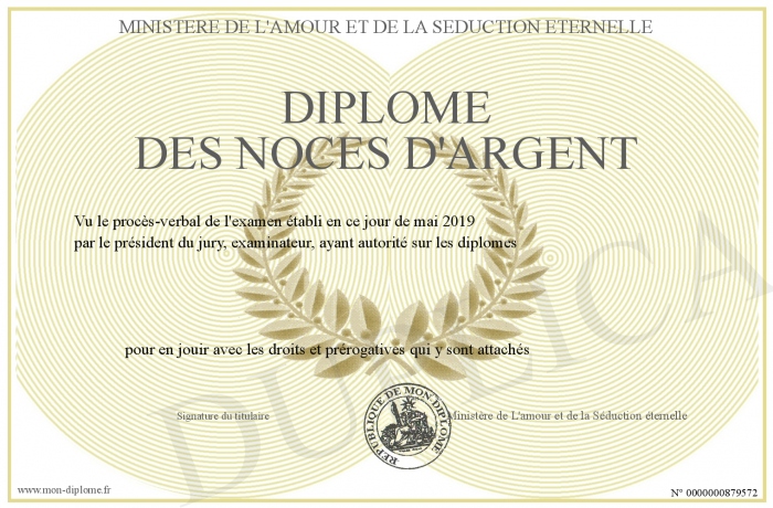 Envoyez par email votre Diplôme des Noces d'argent personalisé