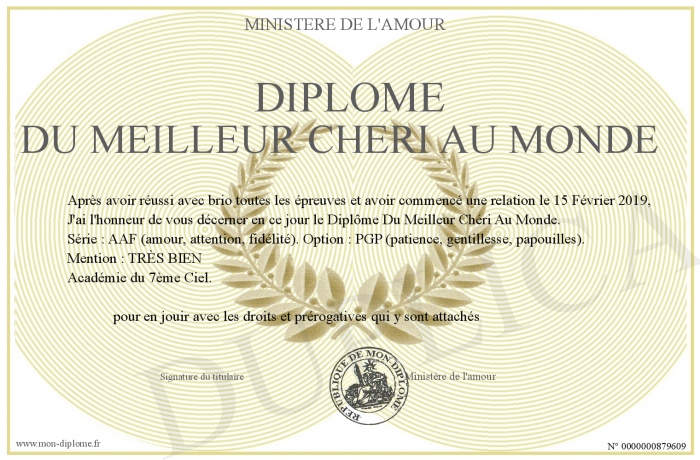 Envoyez par email votre Diplôme du meilleur chéri au monde personalisé