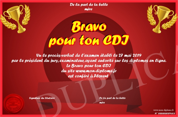 Envoyez par email votre Bravo pour ton CDI personalisé