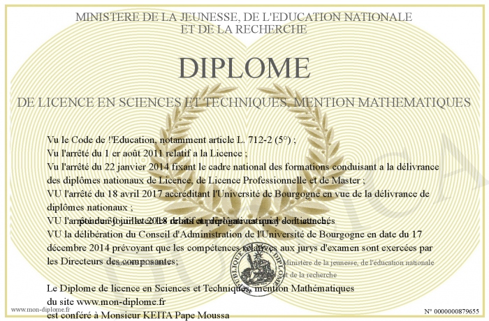 Envoyez par email votre Diplome de licence en Sciences et Techniques, mention Mathématiques personalisé