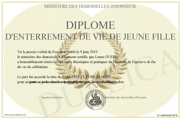 Envoyez par email votre Diplome d'Enterrement de vie de jeune fille personalisé