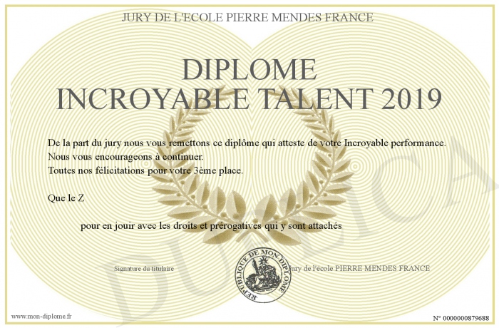 Envoyez par email votre diplôme incroyable talent 2019 personalisé