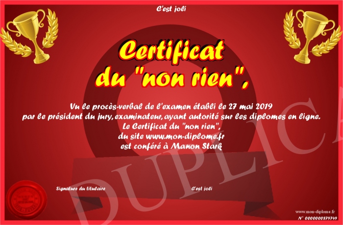Envoyez par email votre Certificat du -non rien-, personalisé
