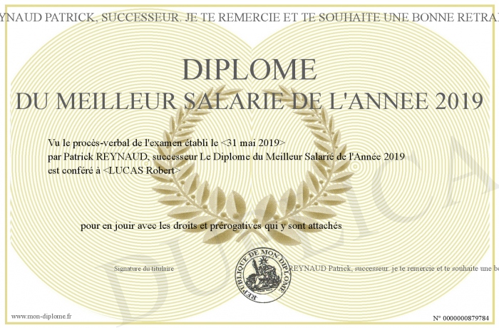 Envoyez par email votre Diplôme du Meilleur Salarié de l'Année 2019 personalisé