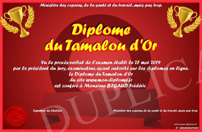 Envoyez par email votre Diplôme du Tamalou d'Or personalisé