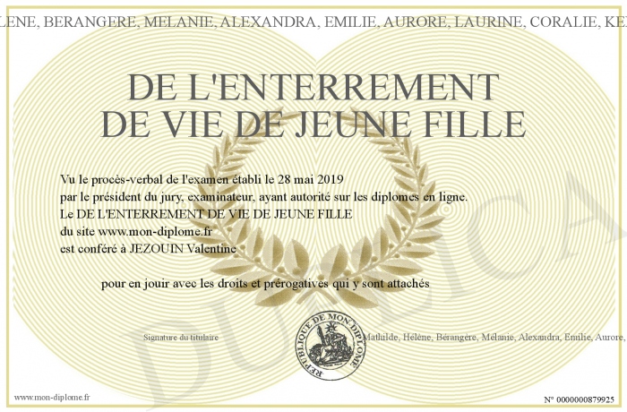 Envoyez par email votre DE L'ENTERREMENT DE VIE DE JEUNE FILLE personalisé