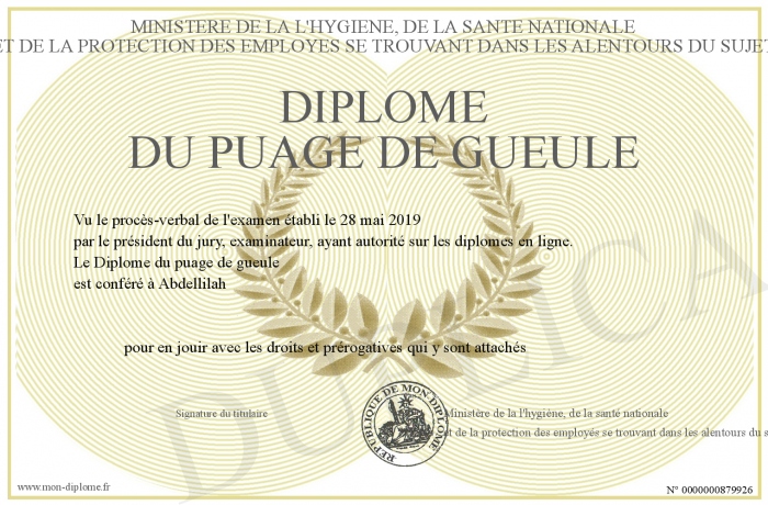 Envoyez par email votre Diplôme du puage de gueule personalisé