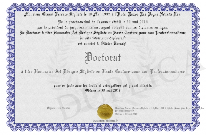 Envoyez par email votre Doctorat à titre Honoraire Art Désigne Styliste en Haute Couture pour son Professionnalisme personalisé
