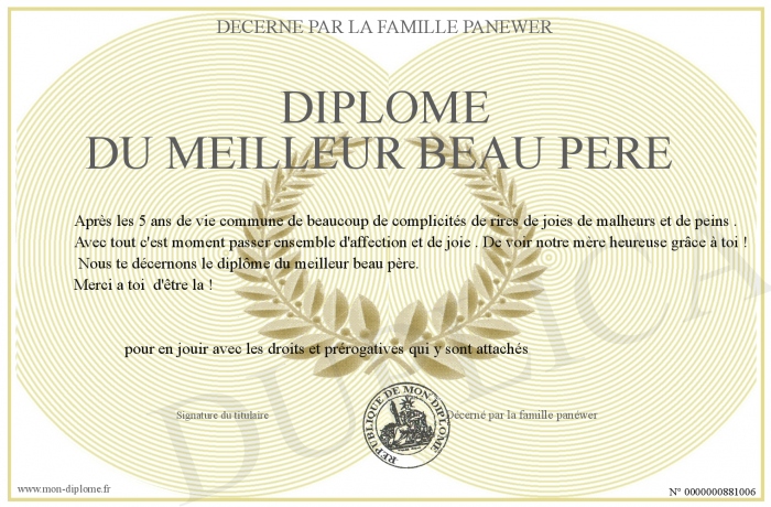 Envoyez par email votre Diplôme du meilleur beau pére personalisé