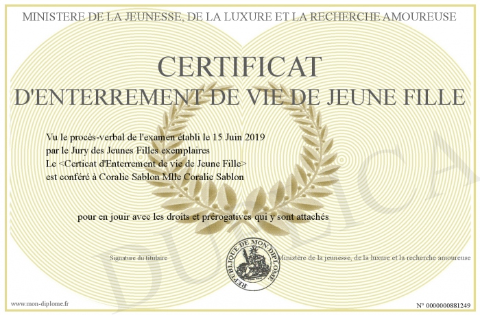Envoyez par email votre Certificat d'Enterrement de Vie de Jeune Fille personalisé