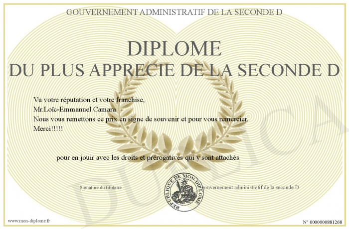 Envoyez par email votre Diplôme du plus apprécié de la seconde D personalisé