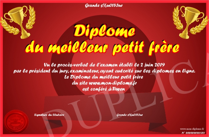 Envoyez par email votre Diplôme du meilleur petit frère personalisé