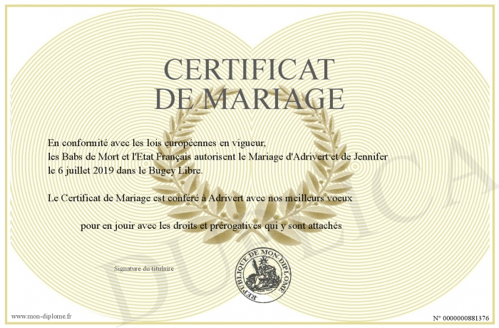 Envoyez par email votre Certificat de Mariage personalisé
