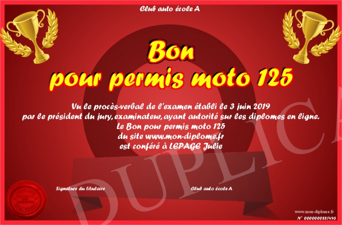 Envoyez par email votre Bon pour permis moto 125 personalisé