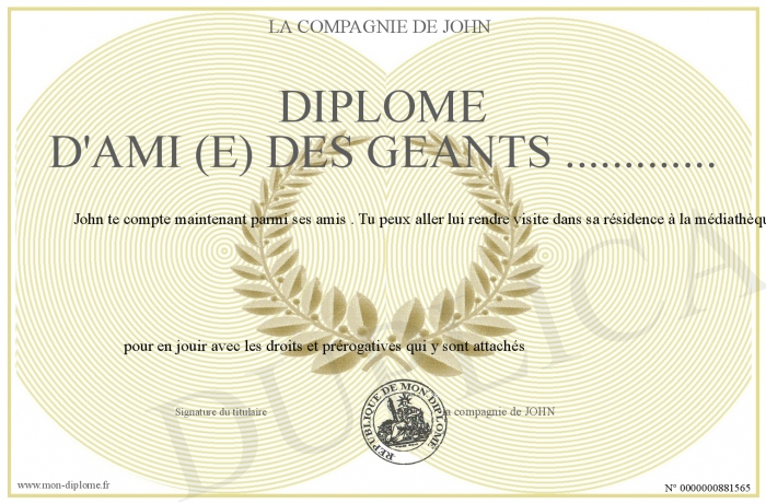 Envoyez par email votre Diplôme d'ami (e) des GEANTS ............. personalisé