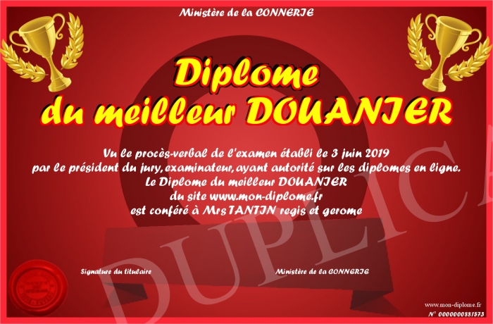 Envoyez par email votre Diplôme du meilleur DOUANIER personalisé