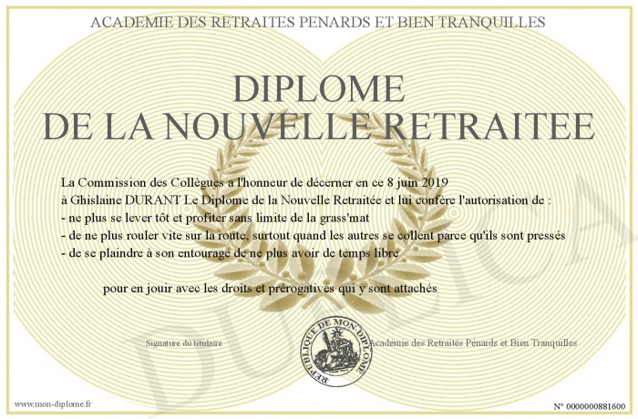 Envoyez par email votre Diplôme de la Nouvelle Retraitée personalisé