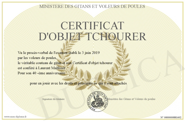 Envoyez par email votre Certificat d'objet tchourer personalisé