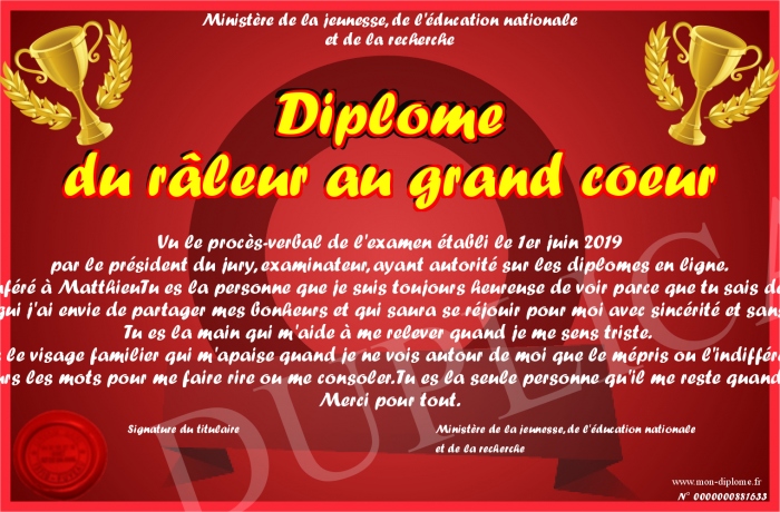 Envoyez par email votre Diplôme du râleur au grand coeur personalisé