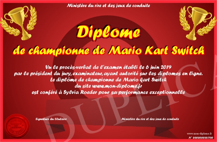 Envoyez par email votre Diplôme de championne de Mario Kart Switch personalisé