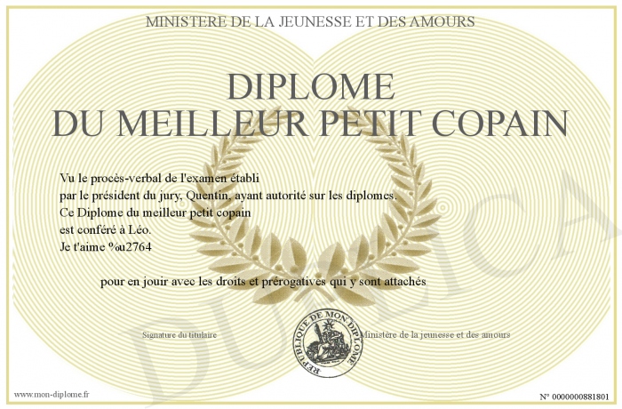 Envoyez par email votre Diplôme du meilleur petit copain personalisé