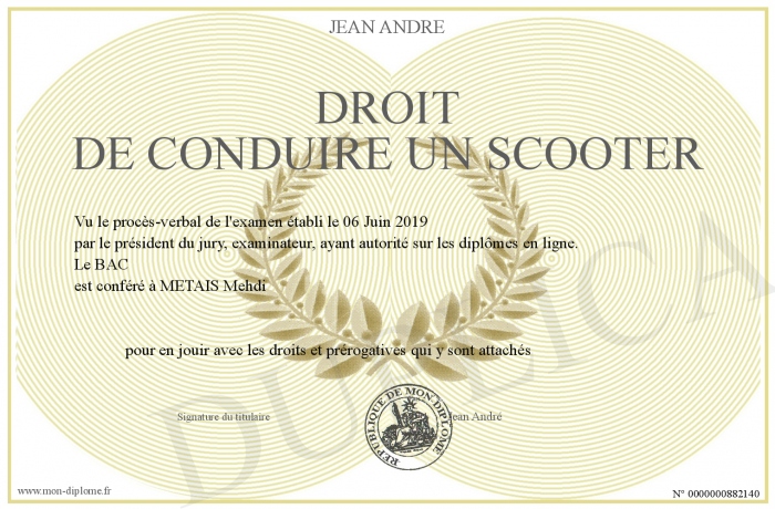 Envoyez par email votre DROIT DE CONDUIRE UN SCOOTER personalisé