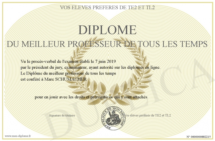 Envoyez par email votre Diplôme du meilleur professeur de tous les temps personalisé