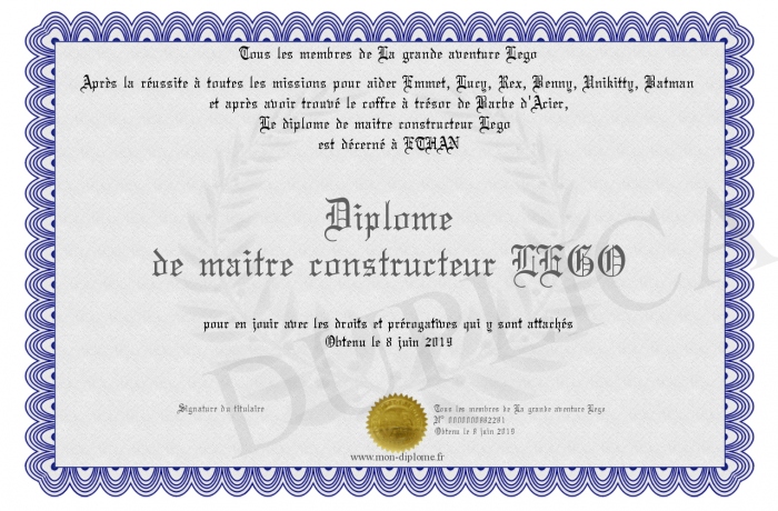 Envoyez par email votre Diplôme de maitre constructeur LEGO personalisé