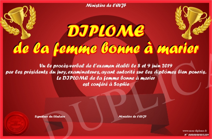 Envoyez par email votre DIPLOME de la femme bonne à marier personalisé