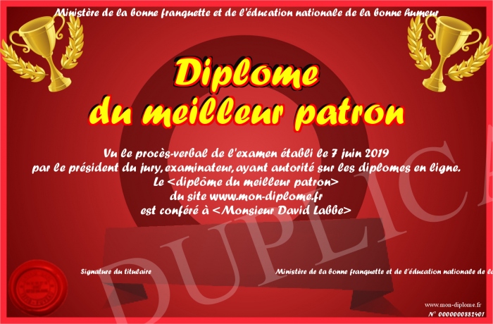 Envoyez par email votre Diplôme du meilleur patron personalisé