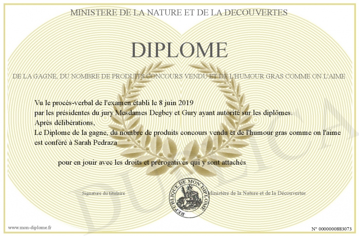Envoyez par email votre Diplôme de la gagne, du nombre de produits concours vendu et de l'humour gras comme on l'aime personalisé