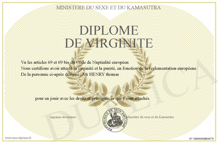 Envoyez par email votre Diplôme de virginité personalisé