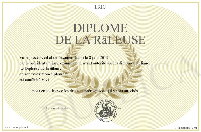Envoyez par email votre Diplôme de la râleuse personalisé