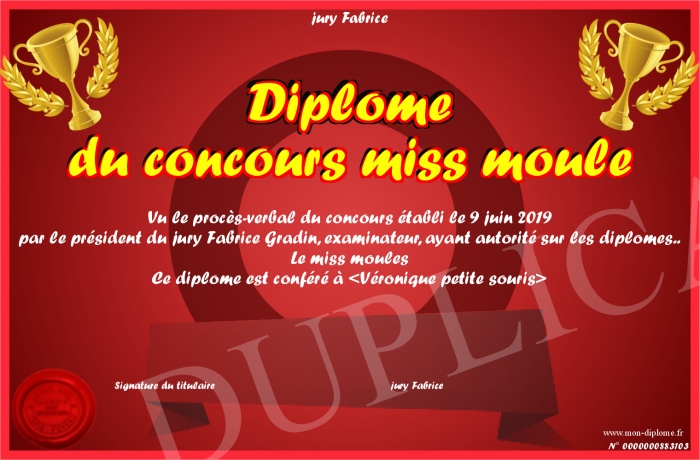 Envoyez par email votre Diplôme du concours miss moule personalisé
