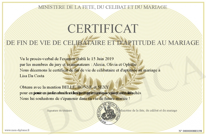 Envoyez par email votre Certificat de fin de vie de célibataire et d'aptitude au mariage personalisé